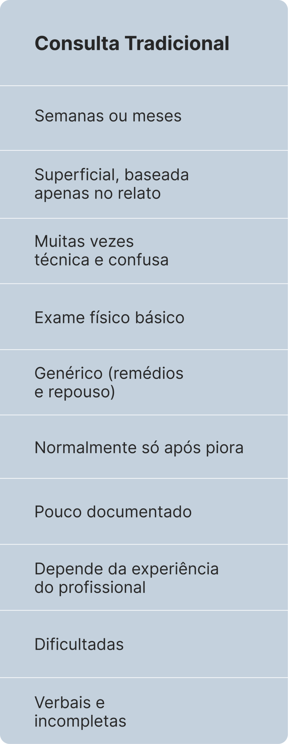 Nada de termos complicados ou consultas corridas. Aqui você entende exatamente o que tem, por que dói e qual é o plano de tratamento. Clareza que evita exames desnecessários e meses de incerteza.