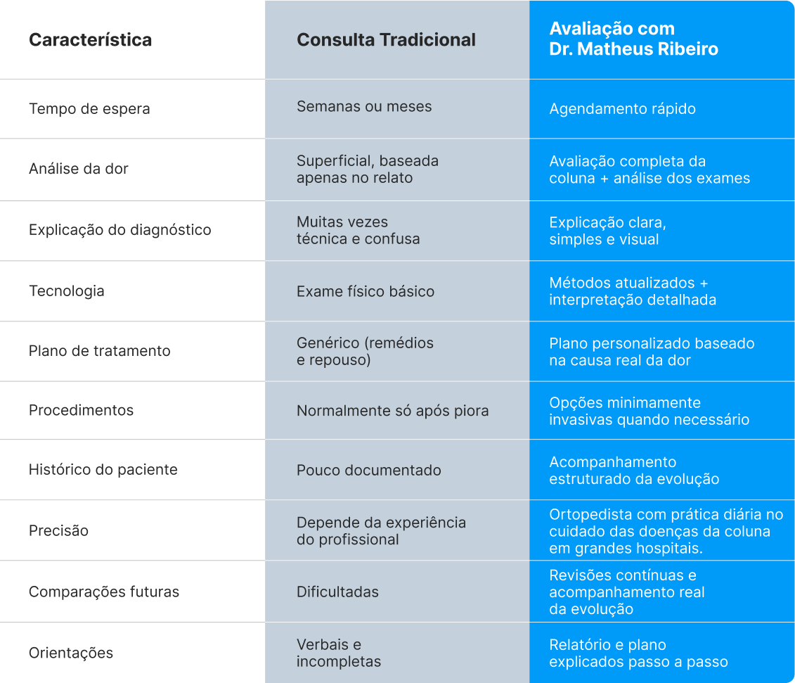 A diferença entre “tentar tratar a dor” e descobrir a causa real está no tipo de avaliação que você recebe. Veja a comparação: